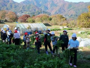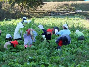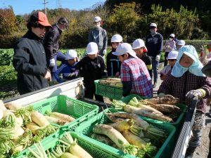 今年も立派に育った大根を収穫することができました。初めて三紀層大根を収穫する1年生は、その大きさに思わず目を丸くし、「ぬけた〜!」「見て見て、こんなに大きいよ!」と喜びの声を上げながら、大根を高く掲げていました。抜けた瞬間の手応えや達成感をしっかりと味わう姿がとても輝い見えました。富草の三紀層大根は、特別な品種ではありませんが、ミネラル豊富な地層で育つため甘みがあり、毎年子ども達も楽しみにしている大根です。この地で大切に栽培し、守りつないでくださっている林さんをはじめ、生産者の皆さんと一緒に、今年の豊作を喜び合うことができました。収穫を終えた畑にそっと向き直り、最後は感謝の気持ちを込めて校歌を斉唱しました。澄んだ空気の中、ハーモニカ伴奏に合わせた子ども達の歌声が、晴れ渡る畑に気持ちよく広がっていきました。大根は、11月29日の土曜参観日の折に2年生が販売する予定です。ぜひご利用ください。