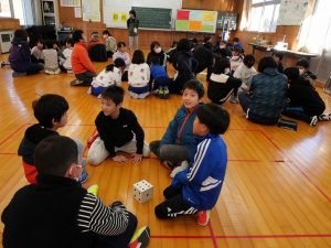 まとめの集会では、「もっと聴くアンテナを伸ばそう」という思いから、前回に引き続きサイコロトークを行いました。今回は前より少し難しいお題もあり、話し出せずに戸惑う子もいましたが、周りの友達が「何でもいいんだよ」と優しく声をかけたり、そっと見守ったりする姿が多く見られ、温かな時間が流れました。