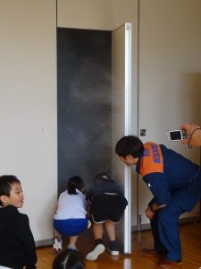 消防署の方々による学年ごとの防災学習が行われました。1・2年生は、多目的スペースに充満した煙の中を迷路のように進み、隠されたイラストを探す体験をしました。立ち上がると前が見えず、かがんで進むことで初めて視界が確保できることを実感し、姿勢一つで安全性が大きく変わることを体で学びました。
