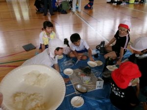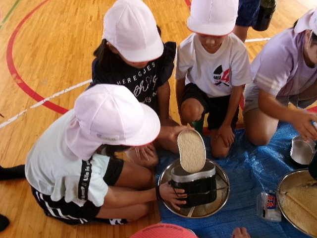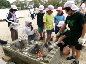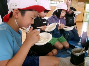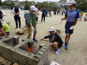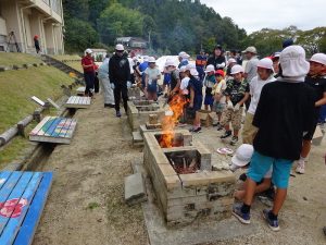みんなで仕事を分担して、力を合わせて飯盒炊さんに挑戦しました。1・2年生はアルファ化米の準備を担当し、決められた水の量を量る仕事をしました。3・4年生は飯盒に米と水を入れる準備を行い、5・6年生はかまどでの火起こしに挑戦。大人は見守るサポートで、できるだけ子ども達自身の力で取り組めるようにしました。火起こしでは思うように火がつかず、何度もマッチをする場面もありましたが、子ども達で相談しながら工夫を重ね、自分たちの力で火をつけることに成功しました。炊き上がったご飯とアルファ化米を食べ比べると、それぞれに違った美味しさがあり、食の大切さを改めて感じたり考えて挑戦し火を起こしたりと貴重な体験となりました。