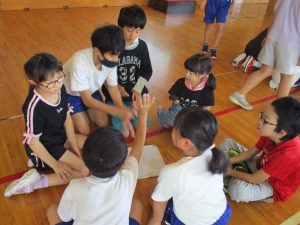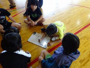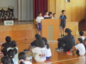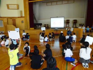 4年生が総合的な学習の時間で取り組んできた「みんなで考え、災害時に役立つ防災知識」の成果を、クイズ形式で全校に発表しました。出題された「油に火が付いたらどうする?」「登下校中に大地震が起きたらどうする?」「防災バックに入れる物は何?」などの問いかけに対し、各学年の子ども達がグループごとに意見を出し合い、真剣に考える様子が見られました。正解が一つに限られない問いで、それぞれの立場から多様な考えが出され、互いに学び合う場面が広がったと思います。また、今日これまでの学習が自然とつながっている様子もありました。あるグループの3年生からは消防署の体験学習で取り上げられた「119番通報」の答えが出るなど、子ども達が自分の体験を生かして発言する姿がありました。