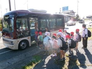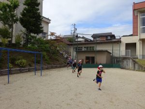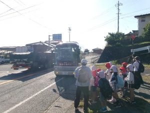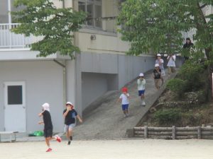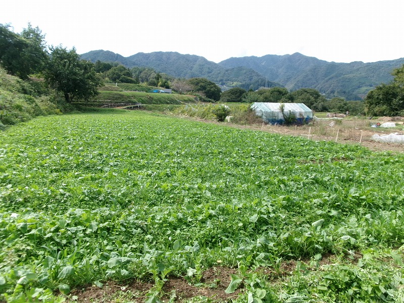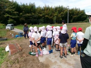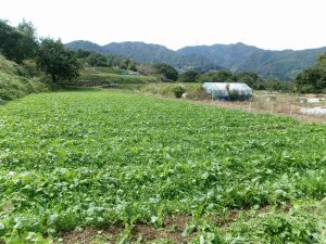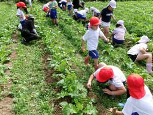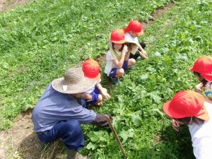1~3年生が大根の畑で草とりを行いました。参加人数は少なめでしたが、その分一人ひとりがやりがいを感じる量で取り組むことができました。大根の葉が草に埋もれて見分けにくい中、「大根の葉を傷めないように取るんだよ」と林さんに教えていただきながら、子どもたちは丁寧に草を抜いていきました。三紀層の土は草もよく育つため根もしっかりしており、根元を持って力を入れて抜くと土の塊が付いてくる物もありました。作業後は畑がすっきりと整い、大根が土の栄養を吸収して大きく育つのが楽しみです。