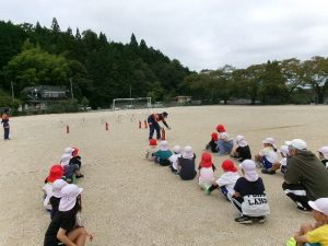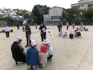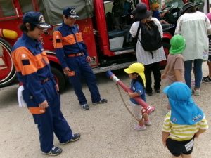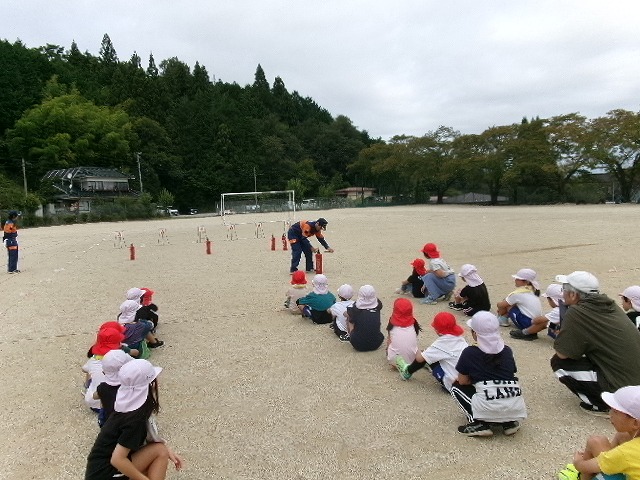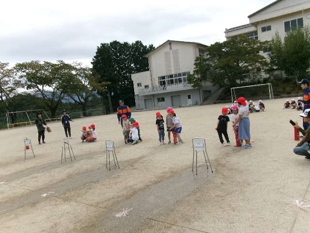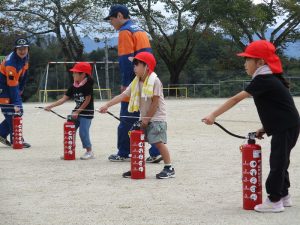 防災フェスでは、富草の消防団の方々による消火器体験も行われました。飯盒炊さんの準備が進む中、1年生から4年生までの児童が参加し、消火器の正しい扱い方や火に見立てた的への当て方を丁寧に教わりました。使用したのは水が出る特別な消火器で、子ども達も安心して挑戦でき、楽しく学ぶことができました。児童 避難訓練に参加していた富草保育園の子達に、1年生が「こうやってやるんだよ」と教えてあげる姿も見られ、小さな先生となって伝えるその様子はとても微笑ましく、富草ならではの学年を越えた温かいつながりを感じました。地域の消防団に支えられてこの防災フェスが続いており、子ども達に防災の知識や自信を与えてもらっています。