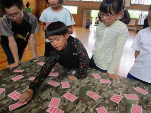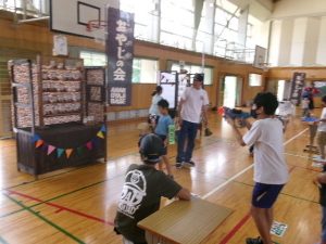 防災フェスの最後を飾ったのは、おやじ(俺たちやっぱり地元が好き)の会による「防災縁日」でした。コンセプトは「あそぼうさい、まなぼうさい」。縁日のようなワクワクする雰囲気の中で、遊びながら防災を学べる工夫がちりばめられていました。会場には射的スペースや記憶ビンゴ、バラバラ文字合わせ、紙皿作り、神経衰弱など6つのブースが並び、子ども達はグループごとに挑戦。友達と協力したり競争したりしながら、防災グッズや知識を自然に覚えていきました。