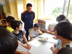 3・4年生は119番通報体験に挑戦しました。専用の機械を使ったやり取りは、本物さながらの緊張感。最初は用意された原稿を読み上げることで対応できていましたが、急な質問に対して答えられず戸惑う様子もありました。相手の質問をよく聞き、自分の言葉で返そうとする姿が見られ、災害時に冷静さが求められることを実感できたと思います。