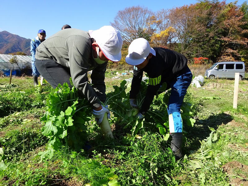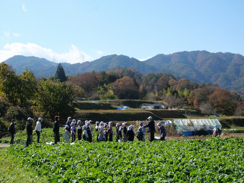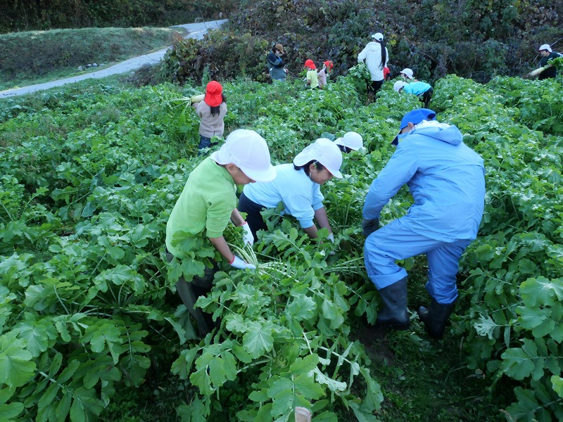 今年も立派に育った大根を収穫することができました。初めて三紀層大根を収穫する1年生は、その大きさに思わず目を丸くし、「ぬけた〜!」「見て見て、こんなに大きいよ!」と喜びの声を上げながら、大根を高く掲げていました。抜けた瞬間の手応えや達成感をしっかりと味わう姿がとても輝い見えました。富草の三紀層大根は、特別な品種ではありませんが、ミネラル豊富な地層で育つため甘みがあり、毎年子ども達も楽しみにしている大根です。この地で大切に栽培し、守りつないでくださっている林さんをはじめ、生産者の皆さんと一緒に、今年の豊作を喜び合うことができました。収穫を終えた畑にそっと向き直り、最後は感謝の気持ちを込めて校歌を斉唱しました。澄んだ空気の中、ハーモニカ伴奏に合わせた子ども達の歌声が、晴れ渡る畑に気持ちよく広がっていきました。大根は、11月29日の土曜参観日の折に2年生が販売する予定です。ぜひご利用ください。