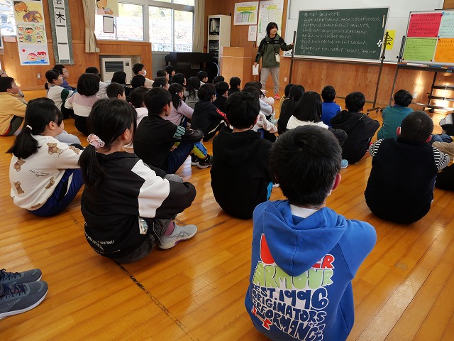 秋の読書旬間は今日が最終日で、町の図書館の方による読み聞かせが、良い締めくくりとなりました。読み聞かせの時間はお話しのろうそくに火をともすところから始まり、子ども達の表情も物語の世界へ引き込まれていきました。低学年の子ども達は、世界のお話「アナンシと五」を読み語りで聴きました。魔女の呪いがかかった「五」という言葉を口にすると命を落としてしまう物語で、登場人物が「五」と言いそうになる場面では、子ども達が思わずドキドキしながら物語を追う姿が見られました。絵のない読み語りでありながら、子ども達は耳で聞いた言葉から場面を想像し、物語の世界を存分に楽しんでいました。この読書旬間では、図書委員会の活動を通して、いつもより多くの本に親しむことができました。今回の読書をきっかけに、これからも本に親しみ、豊かな感性を育んでほしいと思います。