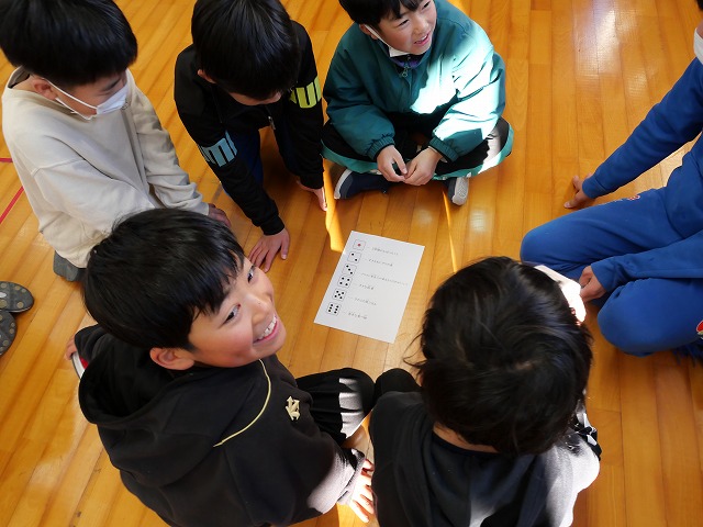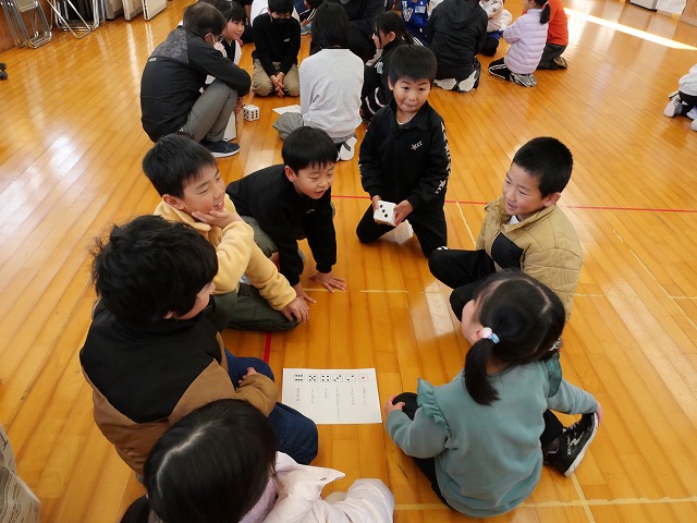 まとめの集会では、「もっと聴くアンテナを伸ばそう」という思いから、前回に引き続きサイコロトークを行いました。今回は前より少し難しいお題もあり、話し出せずに戸惑う子もいましたが、周りの友達が「何でもいいんだよ」と優しく声をかけたり、そっと見守ったりする姿が多く見られ、温かな時間が流れました。
