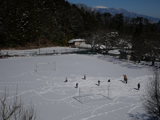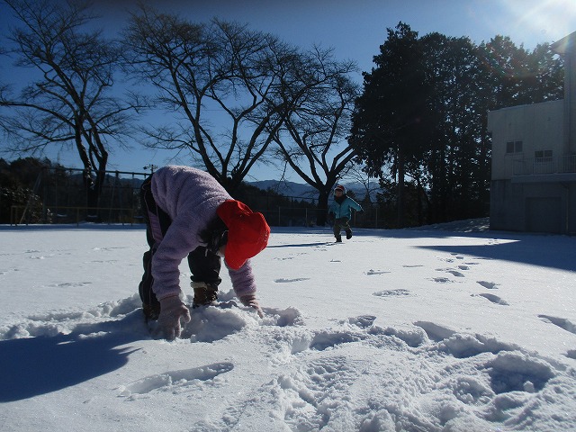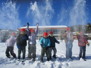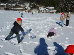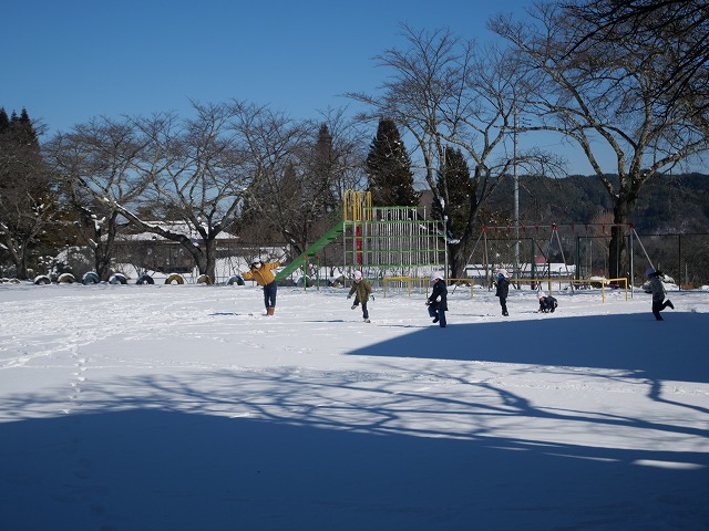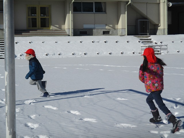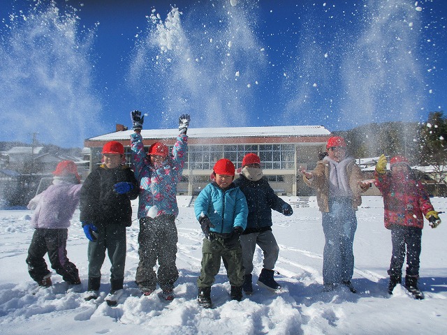 強い冬型の気圧配置となり、富草地区にも雪が積もりました。校庭に白く広がった雪原に向かい、子ども達は元気いっぱい飛び出していきました。ふわふわの雪を空に投げ上げると、光を受けてきらきらと舞い落ちます。笑顔に包まれ、校庭には冬ならではの美しい時間が流れていました。