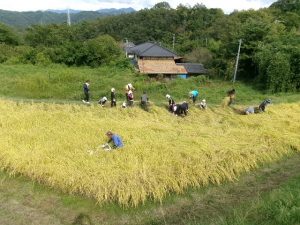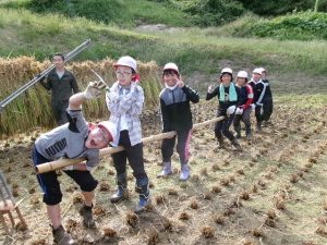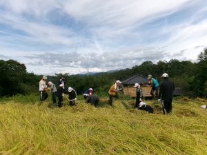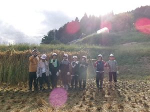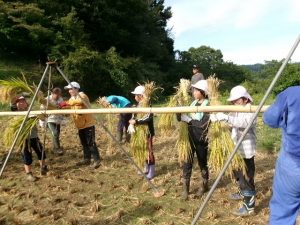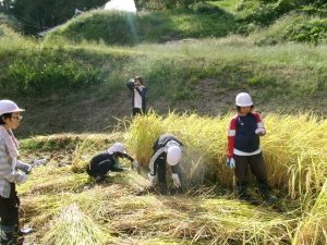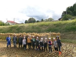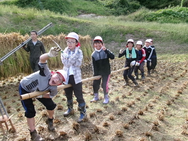 5年生が春に田植えをした田んぼで、ついに稲刈りの日を迎えました。前日の雨で田んぼは少しぬかるんでいましたが、秋らしい爽やかな風に包まれ、心地よい稲刈りとなりました。秋のとんぼがとまる黄金色の稲を、一株ずつ手に取り、子どもたちは鎌を使って「ザクッ、ザクッ」と力強く刈りました。その手応えに、「きゅうりを切るみたいで気持ちいい!」と笑顔を見せる子も。刈り取った稲は6束ずつにまとめ、お家の方に縛っていただきました。縛り方は難しく、少し気を抜くと束が崩れてしまいます。お家の方に助けていただきながら、最後はみんなで協力してはざかけまで無事に終えることができました。子どもたちは泥だらけになり、汗を流しながら一生懸命作業をしました。この経験が、より一層の美味しさへとつながっていきます。2週間ほど天日で乾燥させた後は、いよいよ脱穀です。次の作業も、みんなで力を合わせて頑張ります!