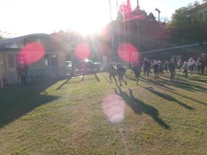 初回の放課後練習は雨のため中止となり、今日が初めての練習日となりました。学校での体育の時間は平らなグラウンドで走っていますが、放課後練習では学校下の富草グラウンドを中心に、坂道を使ったコースで練習を行います。坂道ではスピードを保つのが難しく、息が上がりやすくなります。走り慣れていないうちは苦しさを感じることもありますが、本番のマラソン大会のコースにはアップダウンが多くあります。そのため、平らではない道でもしっかりと走り込み、本番に向けて力をつけていきたいと思います。6時間目の授業を終えた子どもたちは、荷物をきちんと整え、前向きな気持ちで練習に臨んでいました。夕日に照らされながら走る姿はとても爽やかです。