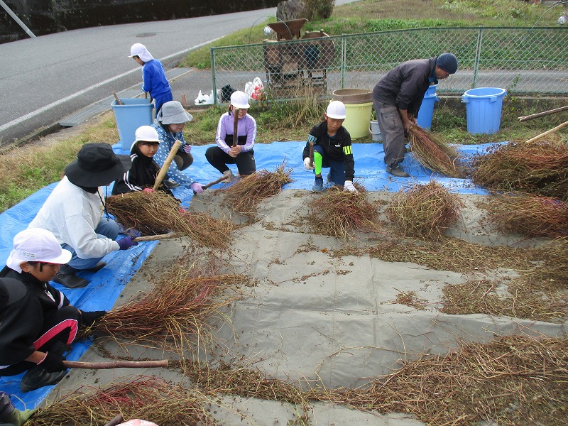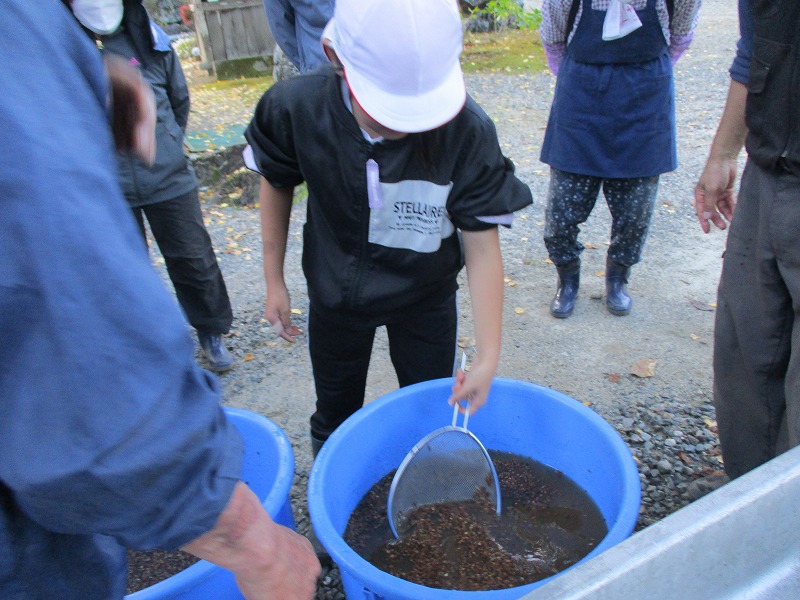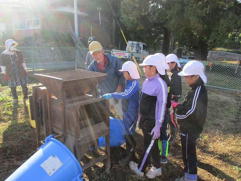 今日は日中、比較的気温も高く、そばの脱穀作業にぴったりの一日でした。脱穀作業では、昔ながらの道具・唐箕を使って、そばの実に混じったごみを風の力で飛ばす体験を行いました。回すたびに風が起こり、落ち葉や砂が飛ばされていくと、混ざり合っていたそばの実が少しずつきれいになっていきます。その様子を見た子どもたちは「すごい!」と感動していました。作業の後は、関昌寺の境内に上がって、そばの実を洗う工程を体験しました。水の中でさらにきれいになっていくそばの実を見て、「おいしいそばになったね」とそば打ち体験に期待感を抱いた子どもたちでした。昔の人々の知恵と工夫を体験しながら、自然の恵みに感謝する日となりました。