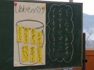 絵本 「しあわせのバケツ」 を題材にした校長先生のお話しを通して、思いやりややさしさについて考えました。心の中にある見えないバケツに「幸せ」が入ると、心が満たされていくお話しです。お話しの途中で、空っぽのバケツの絵を提示し、「どうしたらしあわせのバケツをいっぱいにできるでしょう?」と校長先生が問いかけました。子どもたちから出てきた言葉は、友だちの心(バケツ)を満たす言葉や行動でした。友だちが喜ぶように声をかける、やさしく思いやりをもって接する、「ありがとう」と伝える、友だちが笑顔になってくれるようにするなど、一つひとつが相手を大切に思う温かい言葉でした。子どもたちは、自分のバケツを満たすよりも「誰かのバケツをいっぱいにする」方法を知っています。自分のバケツは周りの友だちに満たされていることを、改めて感じられたのかもしれません。これからも、学校全体で「しあわせのバケツ」を満たし合える温かな時間や関係づくりを大切にしていきたいと思います。