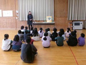 秋の読書旬間は今日が最終日で、町の図書館の方による読み聞かせが、良い締めくくりとなりました。読み聞かせの時間はお話しのろうそくに火をともすところから始まり、子ども達の表情も物語の世界へ引き込まれていきました。低学年の子ども達は、世界のお話「アナンシと五」を読み語りで聴きました。魔女の呪いがかかった「五」という言葉を口にすると命を落としてしまう物語で、登場人物が「五」と言いそうになる場面では、子ども達が思わずドキドキしながら物語を追う姿が見られました。絵のない読み語りでありながら、子ども達は耳で聞いた言葉から場面を想像し、物語の世界を存分に楽しんでいました。この読書旬間では、図書委員会の活動を通して、いつもより多くの本に親しむことができました。今回の読書をきっかけに、これからも本に親しみ、豊かな感性を育んでほしいと思います。