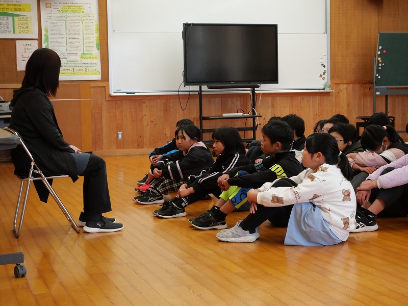 秋の読書旬間は今日が最終日で、町の図書館の方による読み聞かせが、良い締めくくりとなりました。読み聞かせの時間はお話しのろうそくに火をともすところから始まり、子ども達の表情も物語の世界へ引き込まれていきました。低学年の子ども達は、世界のお話「アナンシと五」を読み語りで聴きました。魔女の呪いがかかった「五」という言葉を口にすると命を落としてしまう物語で、登場人物が「五」と言いそうになる場面では、子ども達が思わずドキドキしながら物語を追う姿が見られました。絵のない読み語りでありながら、子ども達は耳で聞いた言葉から場面を想像し、物語の世界を存分に楽しんでいました。この読書旬間では、図書委員会の活動を通して、いつもより多くの本に親しむことができました。今回の読書をきっかけに、これからも本に親しみ、豊かな感性を育んでほしいと思います。