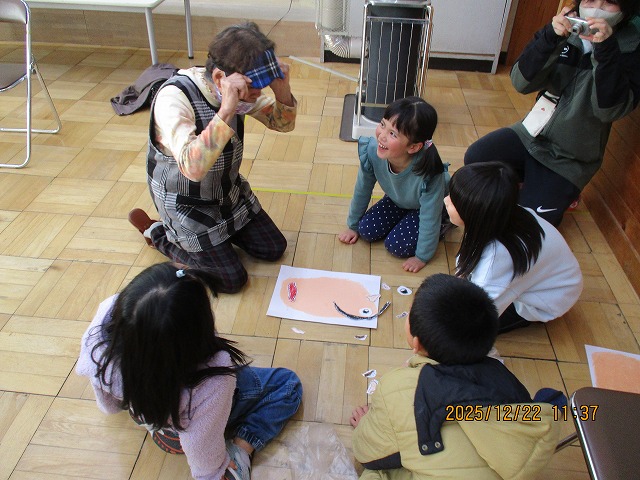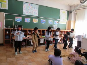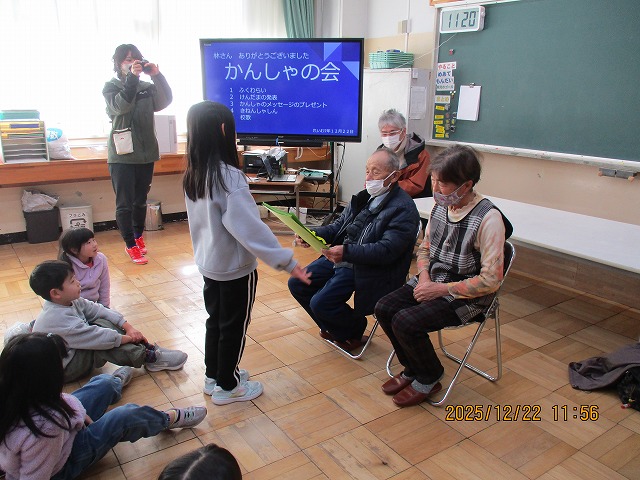 三紀層大根作りで大変お世話になった地域ボランティアの林さんをお迎えし、1・2年生が感謝の会を行いました。林さんご夫婦に楽しんでいただけるよう、子どもたちは心を込めて準備を進めてきました。 手作りの福笑いを一緒に楽しんだり、これまで練習してきたけん玉の発表を披露したりしました。林さんご夫婦のあたたかな笑顔と、それに応える子どもたちの生き生きとした表情が教室いっぱいに広がっていました。最後には、全校児童からの感謝の気持ちをつづったお手紙をまとめたメッセージ集をお渡しし、みんなで記念撮影をしました。感謝の気持ちがあふれ、笑顔が広がる心温まる時間となりました。林さんをはじめ、三紀層大根の生産者の皆様には大変お世話になりました。本当にありがとうございました。