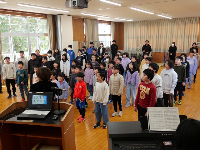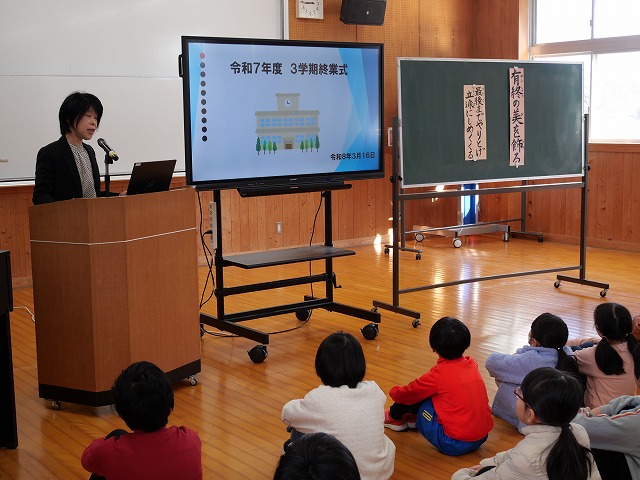 終業式で校長先生から、三学期の始業式で話題にした「有終の美」を振り返りながら、各学年の成長についてのお話がありました。寒い冬も元気に過ごした1年生、学習や活動に集中して取り組んだ2年生、さまざまな挑戦を重ねた3年生、10歳の集いに力を合わせて取り組んだ4年生、児童会を引き継ぎ学校をリードした5年生、そして最上級生として最後まで学校を支えてくれた6年生。それぞれがこの一年で大きく成長したことが紹介されました。また、今後の児童数の変化に伴う複式学級のことや、通知票の修了証についてのお話もありました。式の最後に 校歌を斉唱した子どもたちの歌声からは、この一年をやり遂げた充実感や自信がにじみ出ているように感じられ、三学期、そして一年の締めくくりにふさわしい終業式となりました。